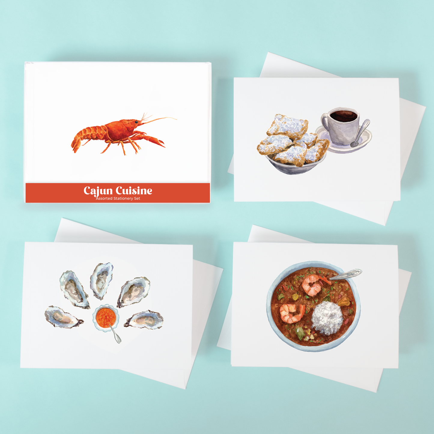 Personalize your gift with our sophisticated card set featuring a collection watercolor cajun cuisine. Perfect for adding a touch of yum to any occassion, this original artwork makes for a thoughtful and delicious choice.