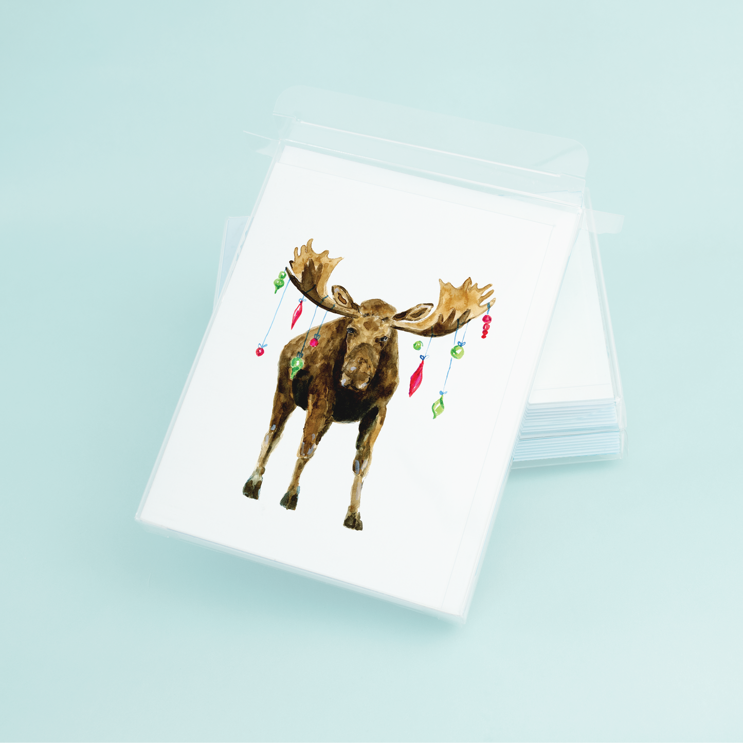 Moose with ornaments hanging from it's antlers Christmas greeting card.