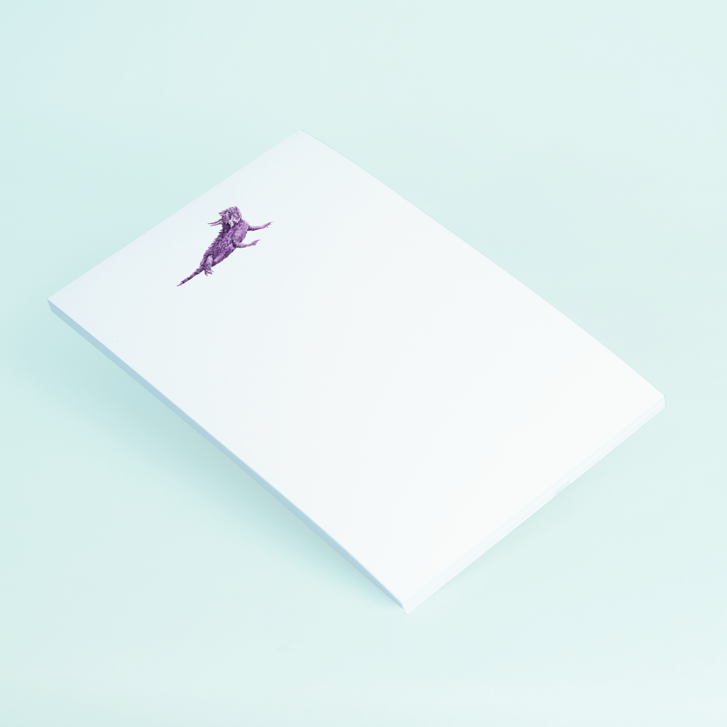 The 50-page 4 x 6-inch top bound notepad featuring an original watercolor design by Dallas based artist Taylor Paladino is a stunning work of art that celebrates the beauty of nature. The notepad features a beautifully detailed purple horned frog expertly painted with watercolors at the top of each page.