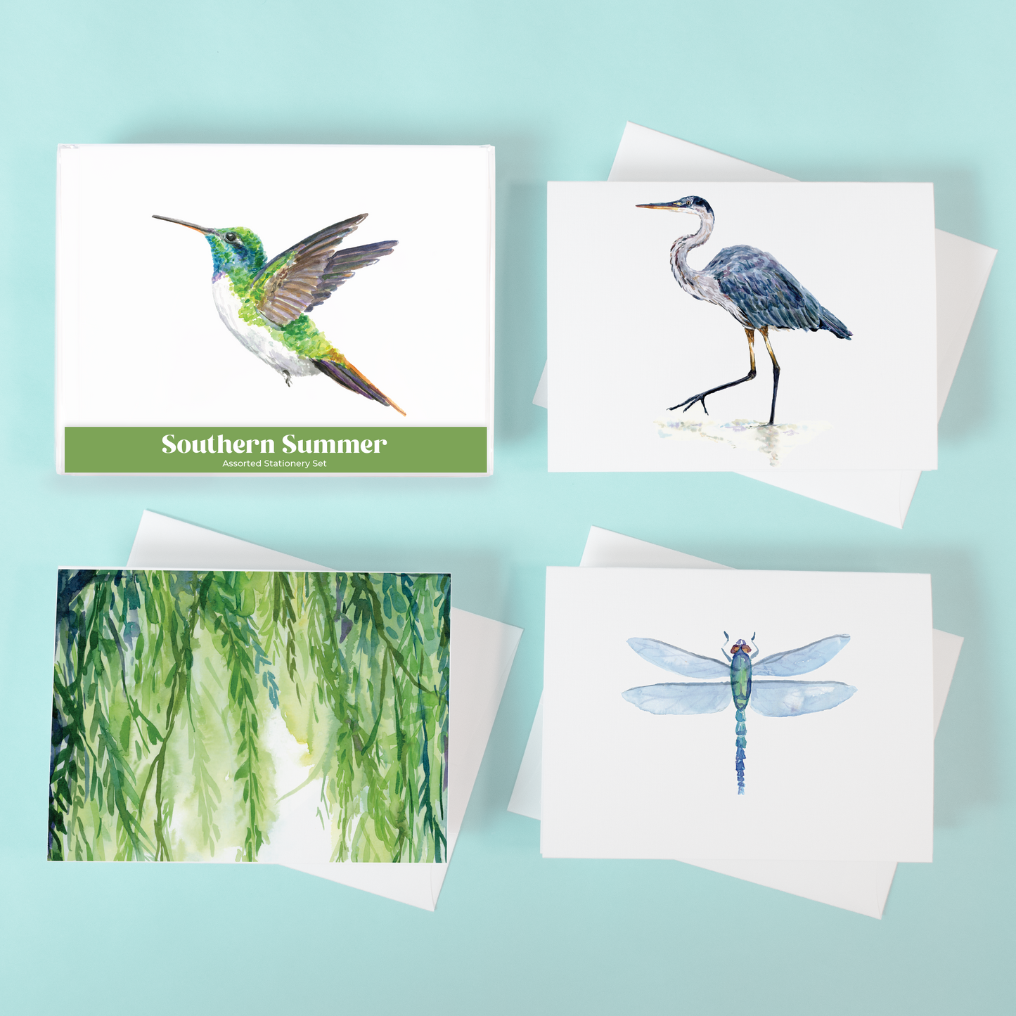 Introducing the A2 Assorted Stationery Set, a delightful collection of handcrafted cards featuring stunning original watercolor designs by the talented Dallas-based artist, Taylor Paladino. Each set includes eight exquisite cards, with two cards of each unique design, made from high-quality linen cardstock. Along with the cards, you'll find nine matching envelopes, making it the perfect all-in-one stationery package.