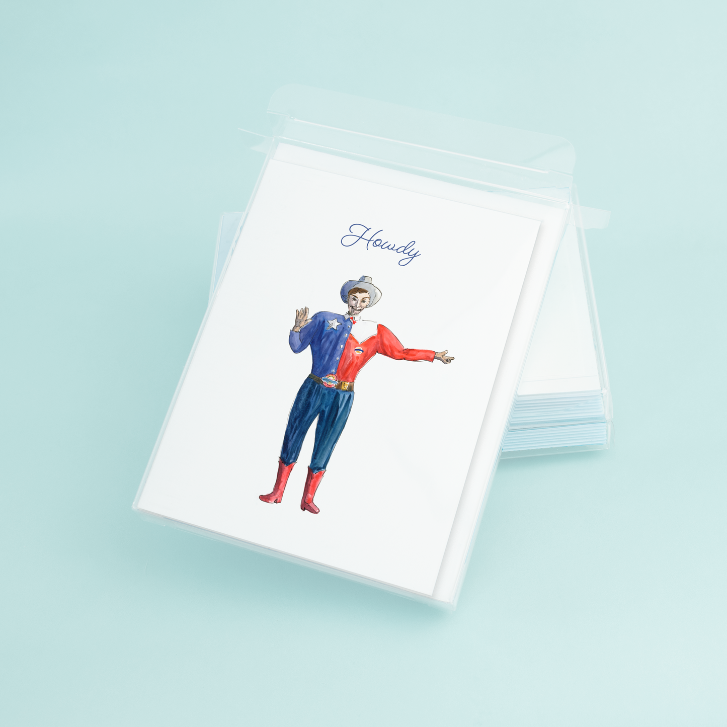 Regular price $3.50Introducing our eco-friendly linen cardstock A2 greeting card, featuring a beautiful watercolor design by talented Dallas-based artist Taylor Paladino. This card is perfect for proud Texans, with its depiction of the Texan - a beloved symbol of the Texas State Fair - expertly painted in watercolors. The word "Howdy" adds a charming and welcoming touch to the front of the card.