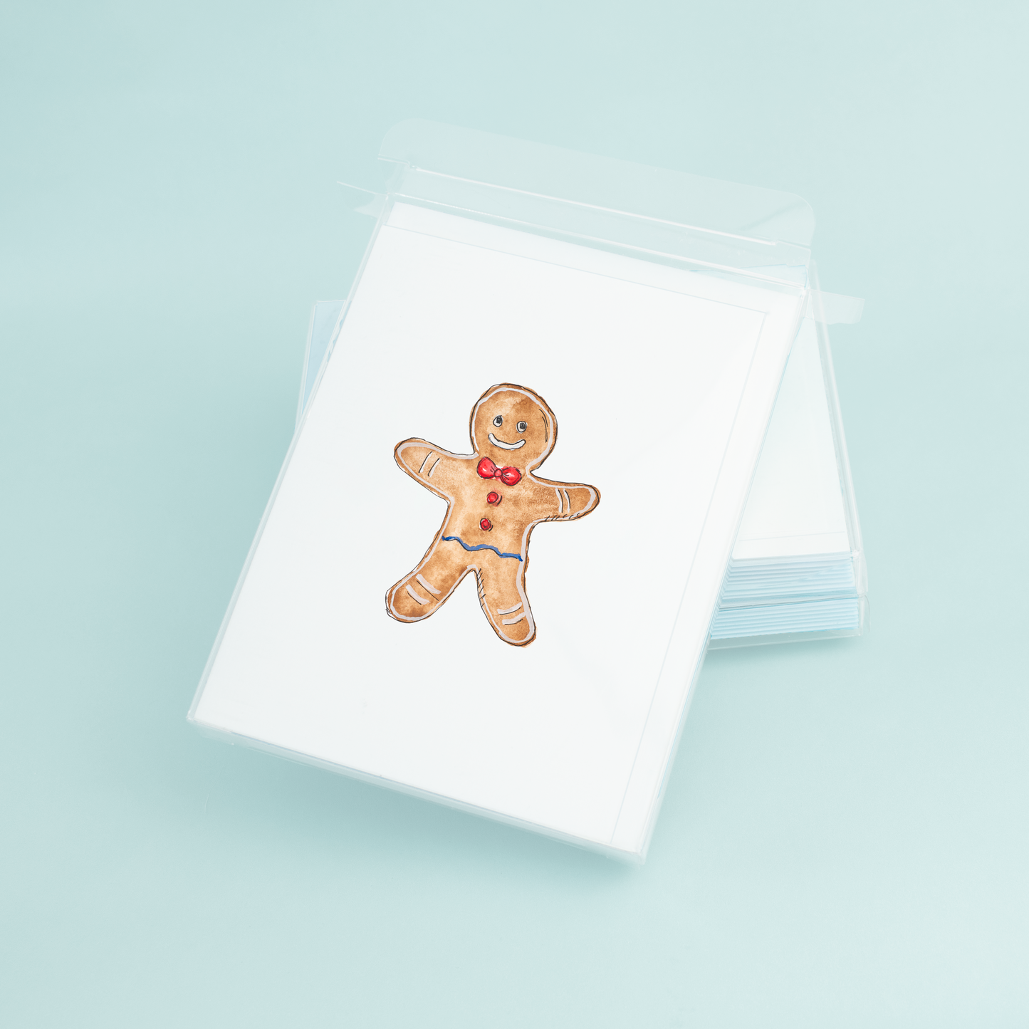 The front of the card showcases a beautifully illustrated gingerbread man, traditionally decorated with icing and candy. Paladino's expert use of watercolors creates a playful and vivid image that captures the joy and warmth of the holiday season.