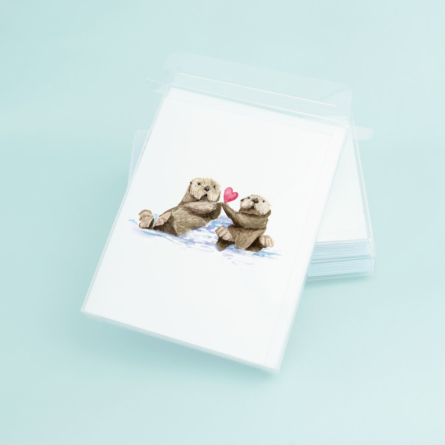 Regular price $3.50Introducing a charming A2 greeting card featuring an original watercolor design by Dallas-based artist Taylor Paladino. This delightful card showcases a pair of lovely otters holding a red heart between them, making it a perfect choice for expressing your love and affection.