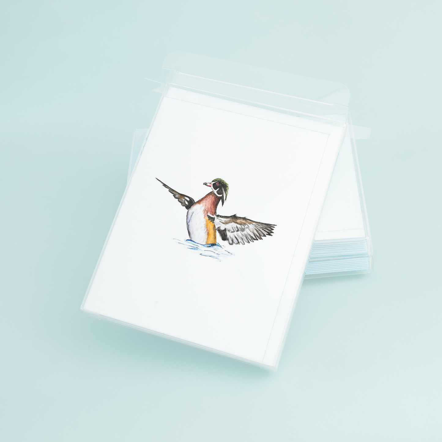 The design itself is a captivating watercolor depiction of a wood duck in water, showcasing Paladino's remarkable talent in capturing the beauty and detail of nature. The colors used in the artwork are a beautiful blend of blues, greens, and browns, creating a serene and tranquil atmosphere that perfectly captures the essence of a peaceful moment in nature.