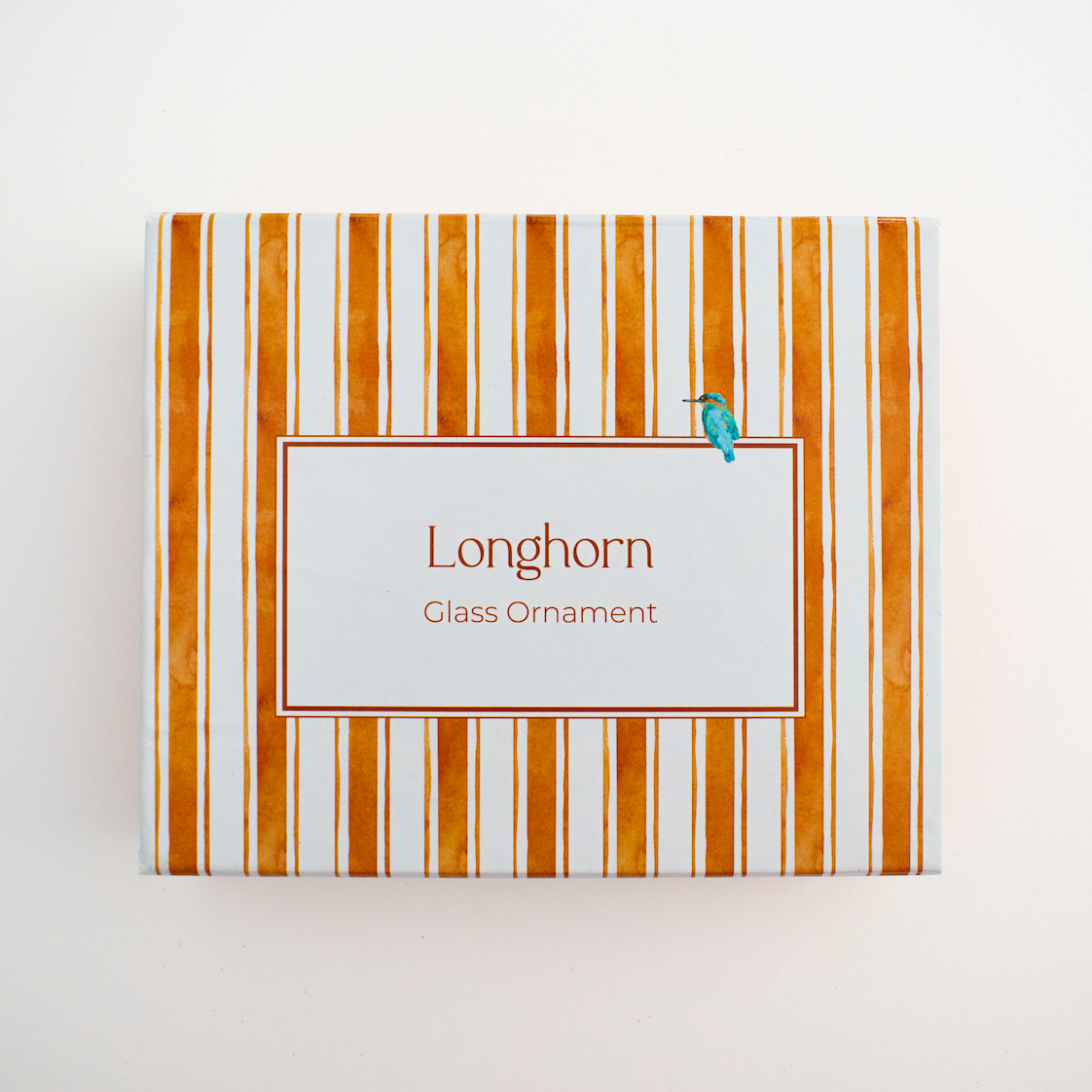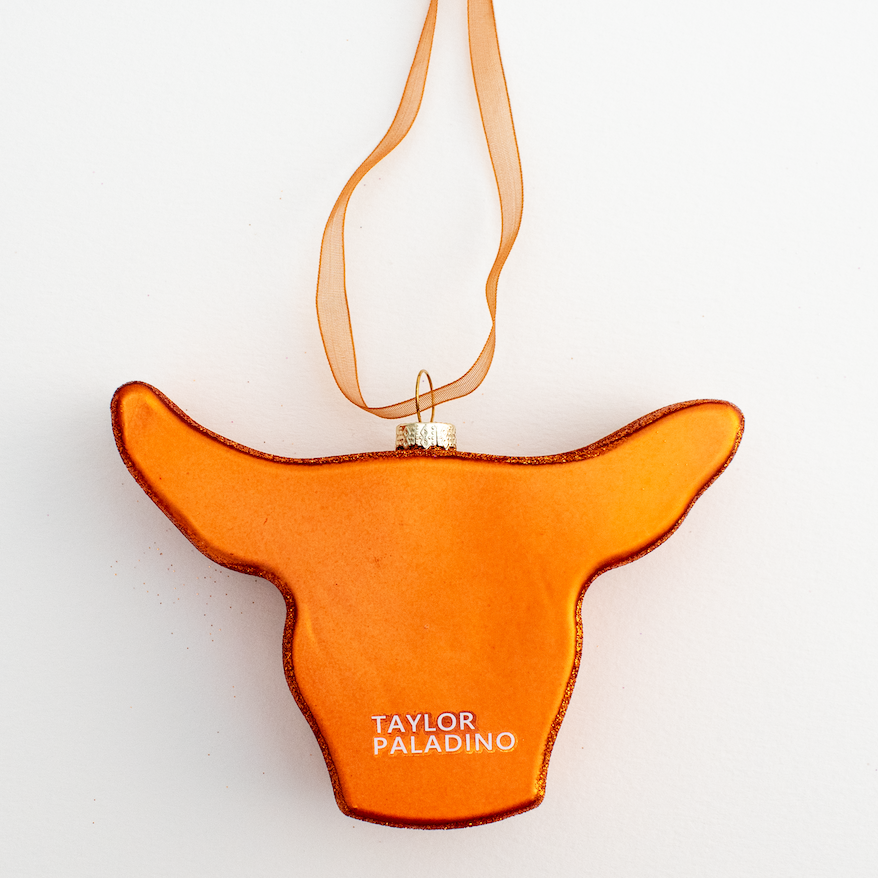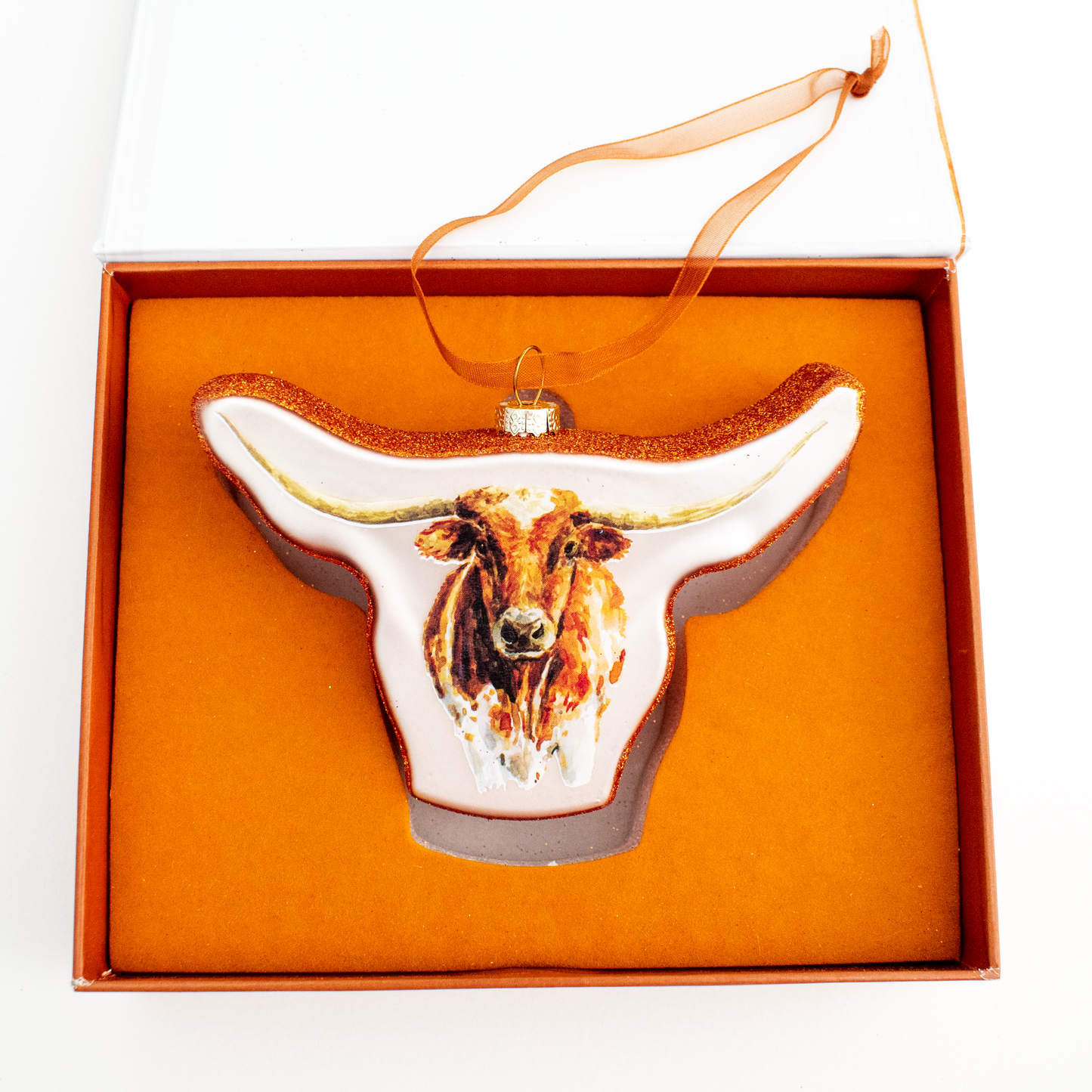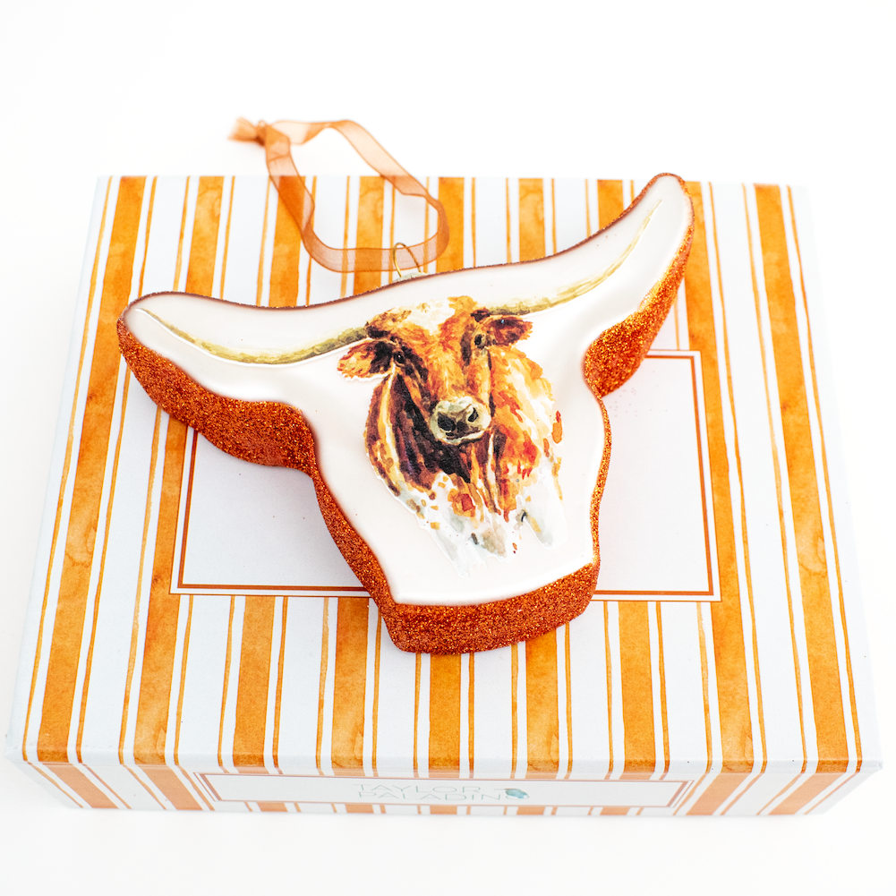 This limited edition glass-blown ornament showcase the fabulous Longhorn Portrait by watercolor artist Taylor Paladino. Featuring burnt orange glittered sides and presented in an elegant gift box, it makes for a delightful holiday gift ideal for longhorn or texan. Its unique artistry adds a charming, Texas touch to any holiday décor!