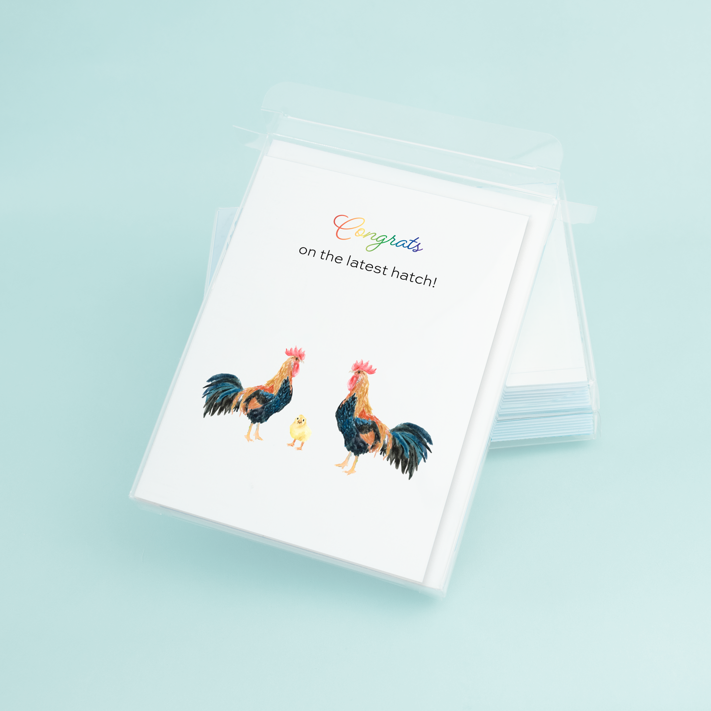 Regular price $3.50Celebrate new beginnings with our charming greeting card featuring two roosters and a chick, accompanied by the heartwarming message "Congrats on the latest hatch." This original watercolor artwork is perfect for baby showers, new parents, or anyone celebrating a joyful arrival. Share your congratulations with this delightful design from Taylor Paladino, capturing the warmth and happiness of a growing family.