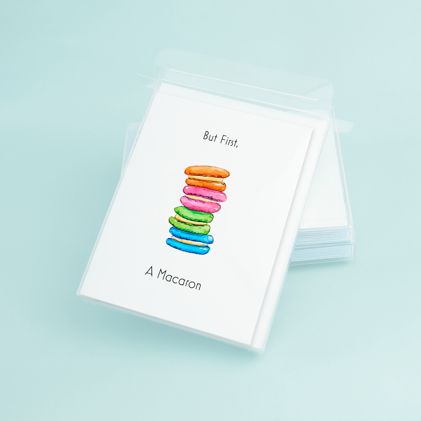 Regular price $3.50Delight your loved ones with our charming macaron greeting card, featuring the fun phrase "But first, a macaron." This original watercolor art card captures the sweet elegance of French macarons, perfect for birthdays, thank you notes, or just because. Make every occasion a little sweeter with this unique and artful design from Taylor Paladino.