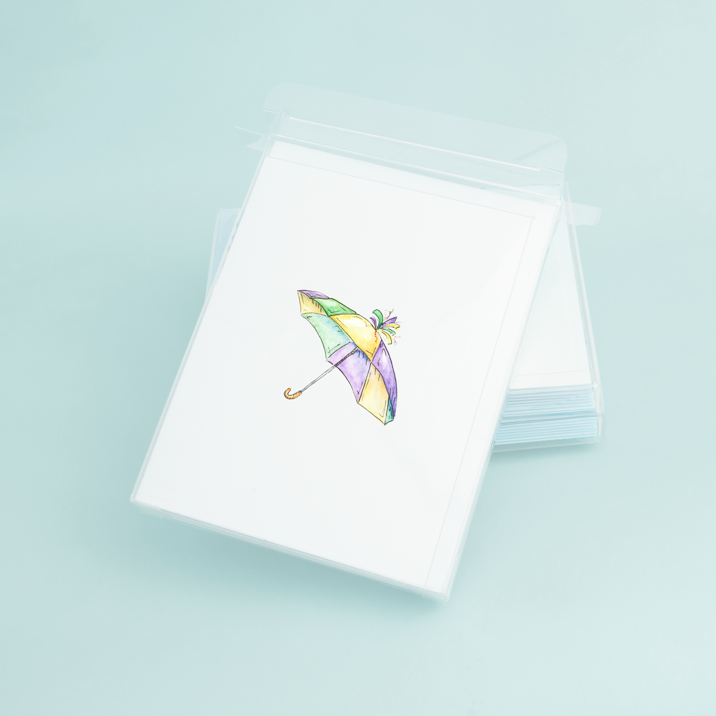 Regular price $3.50Introducing the stunning A2 greeting card featuring the original watercolor art of Dallas-based artist Taylor Paladino. This card showcases a vibrantly colored Mardi Gras umbrella on the front, rendered in breathtaking detail and printed on luxurious linen cardstock.