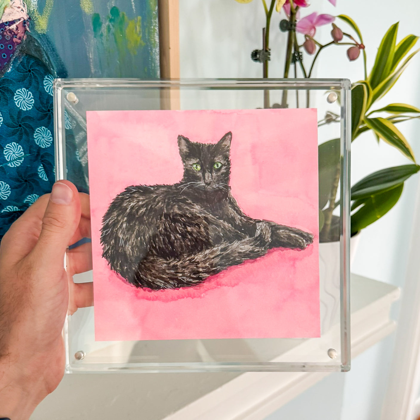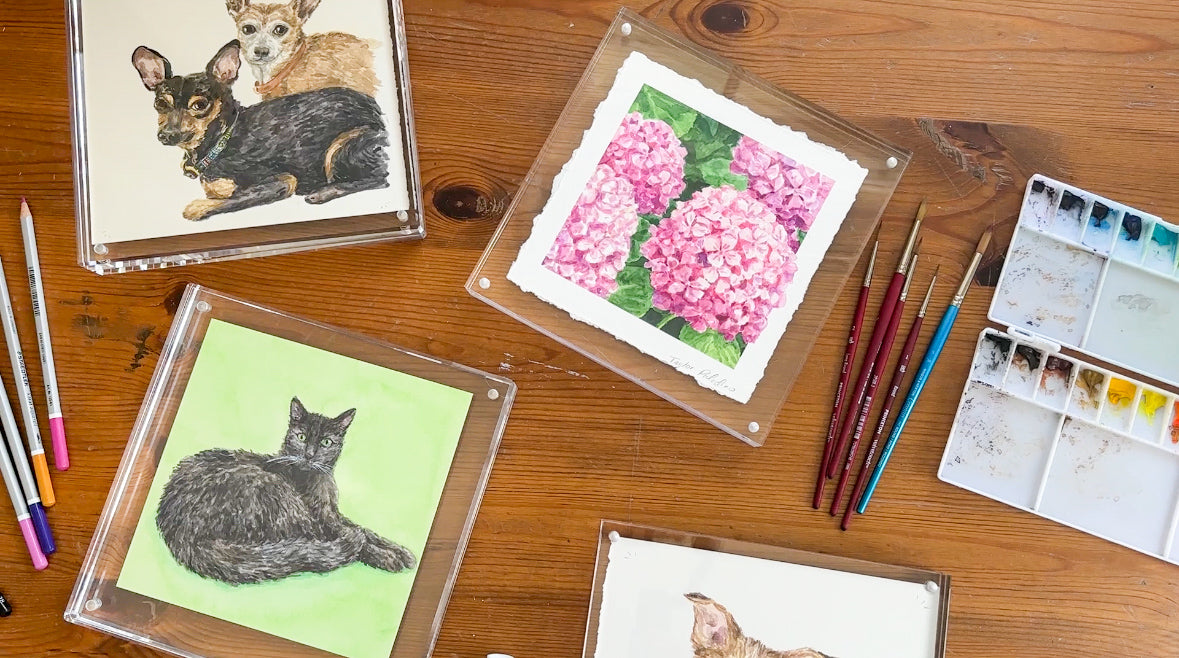 First introduced at Stanley Korshak in Dallas, TX, these charming portraits come beautifully paired with an acrylic block frame. Created with watercolor on archival paper, each piece is designed to capture the unique personality of our beloved best friends!
