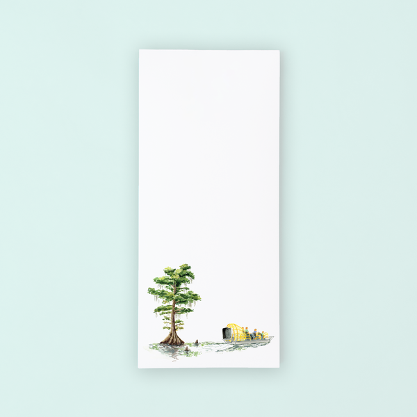 Experience the tranquility of the bayou with our captivating notepad featuring a watercolor scene of a bayou and airboat. Perfect for nature enthusiasts and those enchanted by Southern landscapes, this original artwork captures the essence of Louisiana's unique wetlands. Share a piece of the serene and picturesque bayou with this evocative design from Taylor Paladino, ideal for sending heartfelt messages or conveying a sense of Southern charm and adventure.