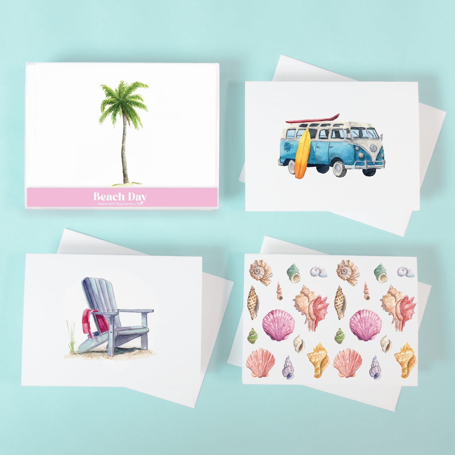 Embrace coastal serenity with our Beach Stationery Set, featuring whimsical watercolor art of a beach chair, Volkswagen bus with surfboard, palm tree, and seashells on each piece. Perfect for capturing the carefree spirit of the shore in your correspondence, this set brings a touch of beachside charm to every note. Share the laid-back vibes and sunny memories with this delightful collection from Taylor Paladino, ideal for beach lovers and anyone who treasures the relaxation of coastal life.