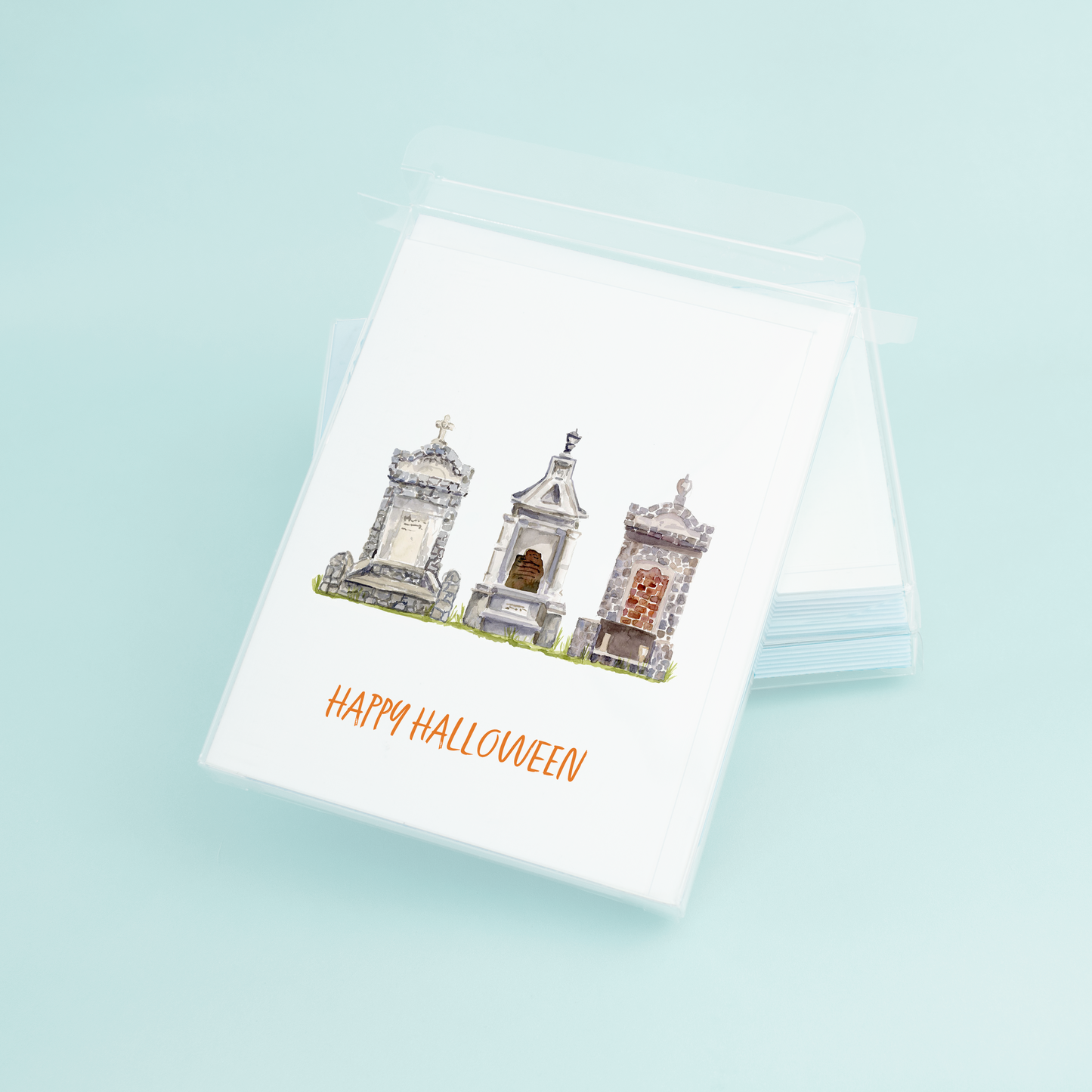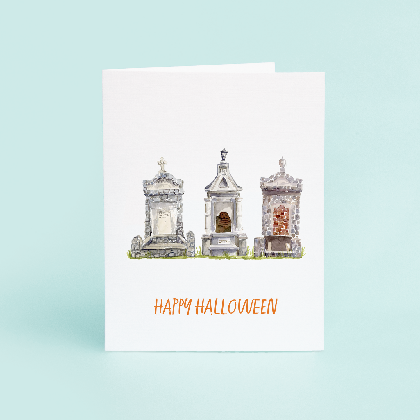 Regular price $3.50Get ready to spook your loved ones with this card featuring an original watercolor design by artist Ben Paladino of Cemetery Crypts. The intricate watercolor design by Ben Paladino captures the eerie ambiance of a spooky cemetery, making it a perfect choice for Halloween. Share the spooky spirit and send your message with our Cemetery Crypts Halloween greeting card.