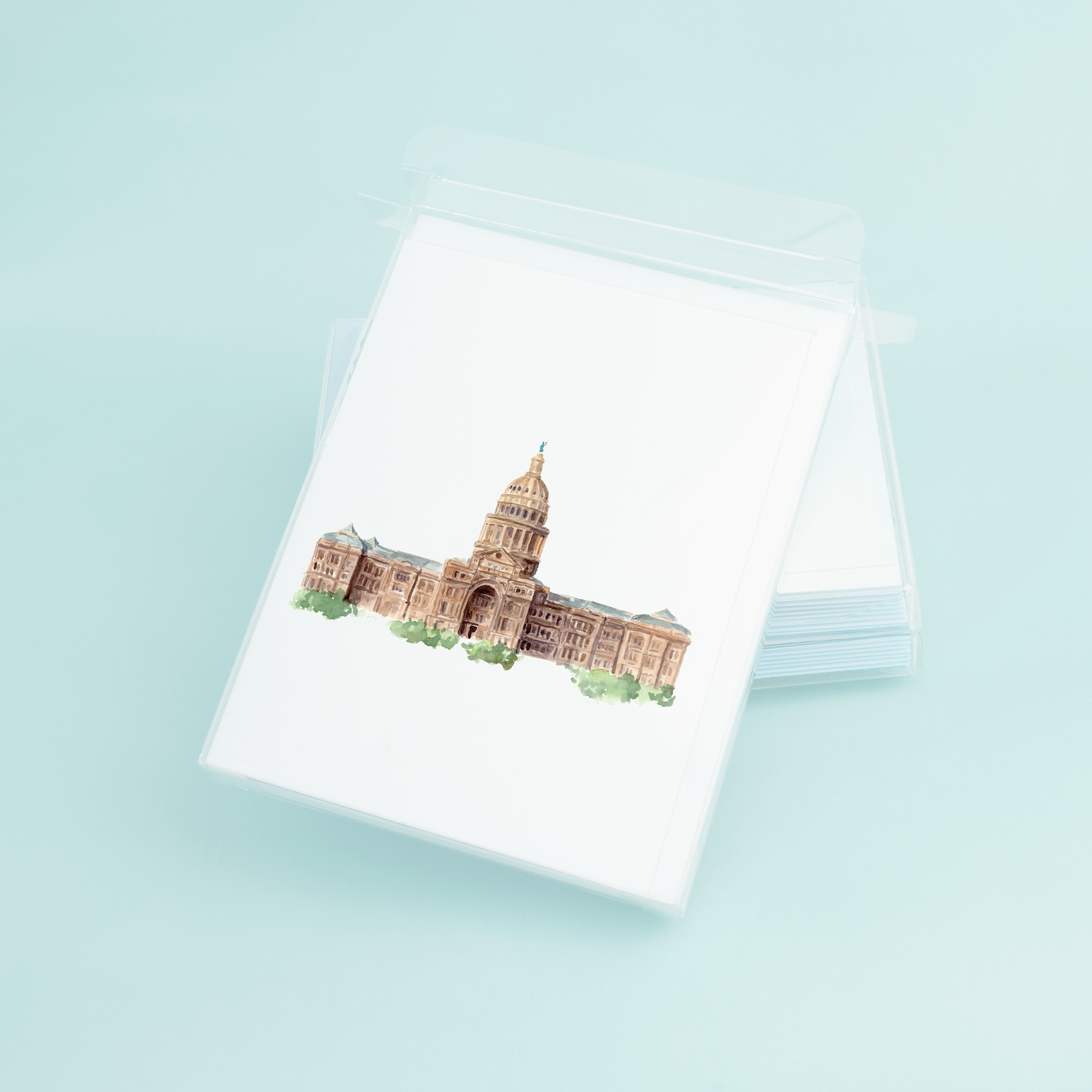 Regular price $3.50Introducing the Texas State Capitol Building Greeting Card by Dallas-based artist Taylor Paladino, now available on eco-friendly linen cardstock! The front of this A2 greeting card features an original watercolor painting of the iconic Texas State Capitol Building in stunning detail, with a vibrant color palette that captures the building's grandeur and majesty. The quality of the linen cardstock ensures that the colors remain crisp and true to life, giving the card a premium look and feel.