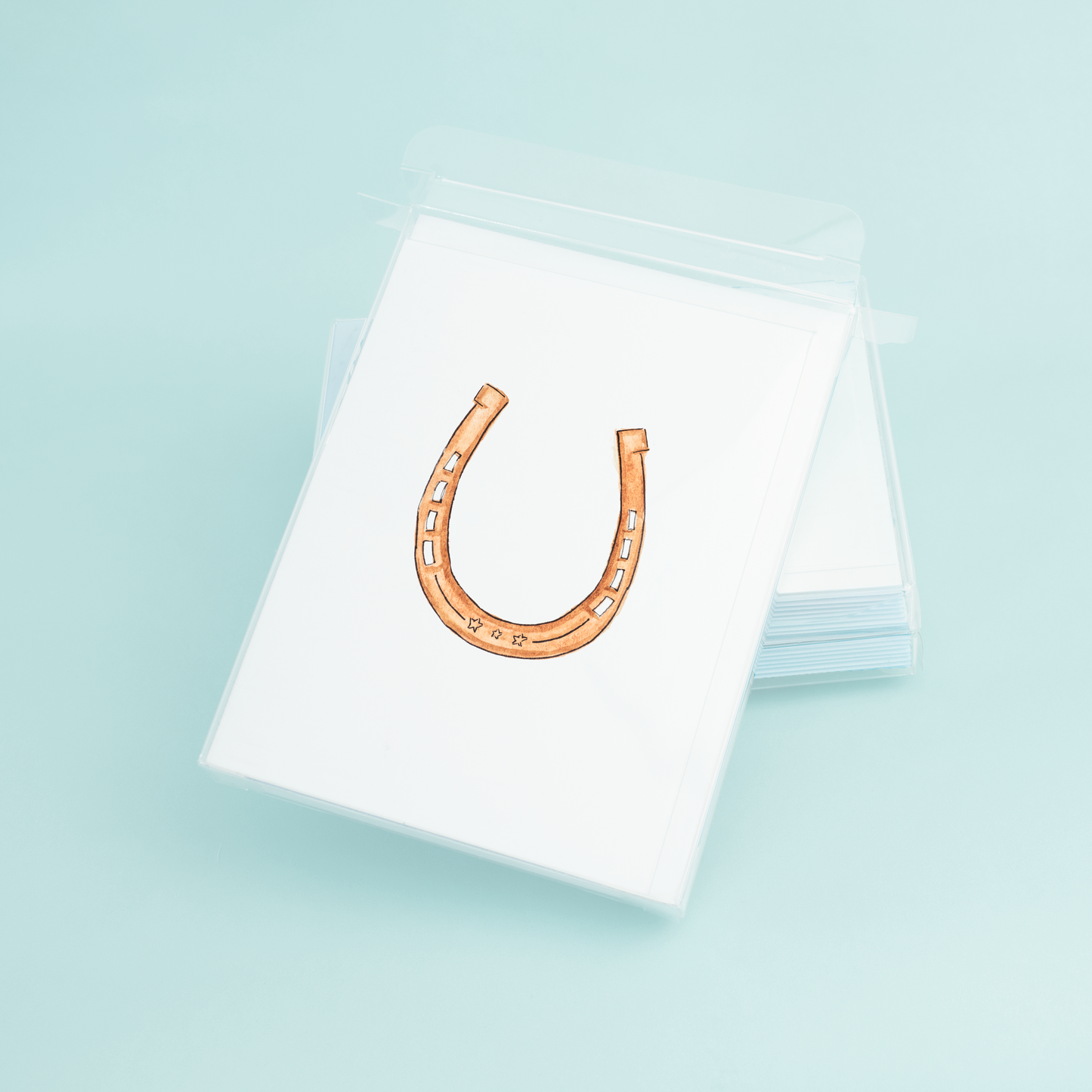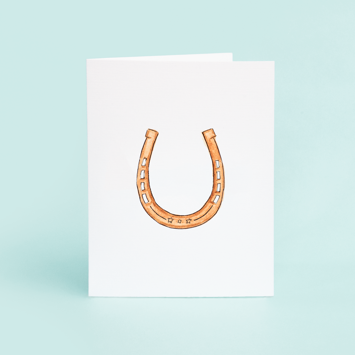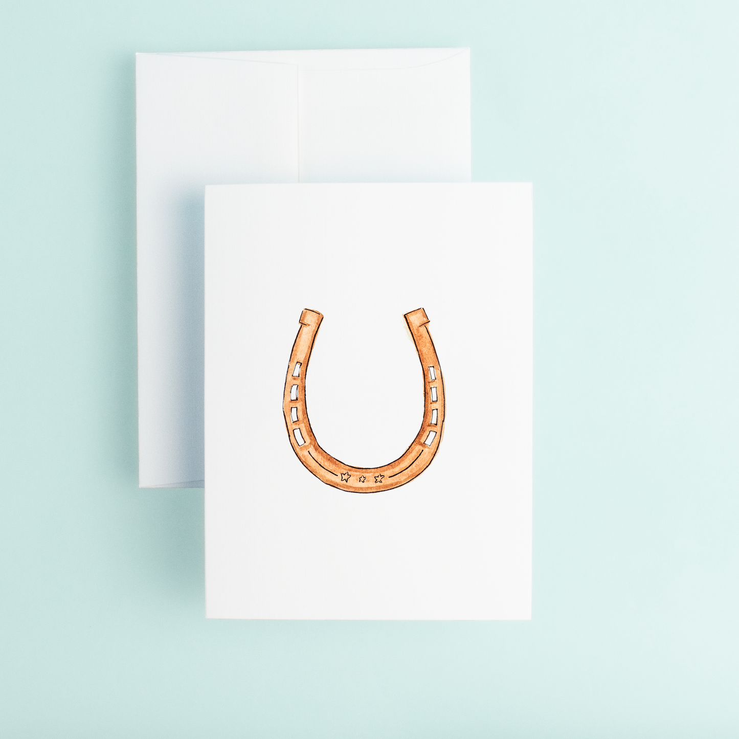 Regular price $3.50Introducing a beautiful A2 greeting card featuring an original watercolor design by Dallas-based artist Taylor Paladino. This stunning card showcases a lucky gold horseshoe on the front, making it a perfect choice for wishing good luck and sending your warm wishes.