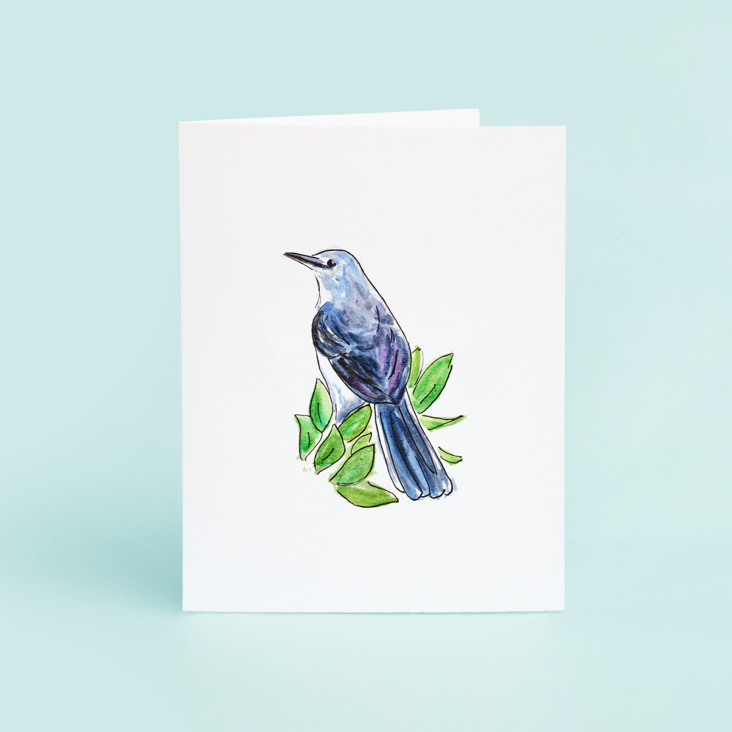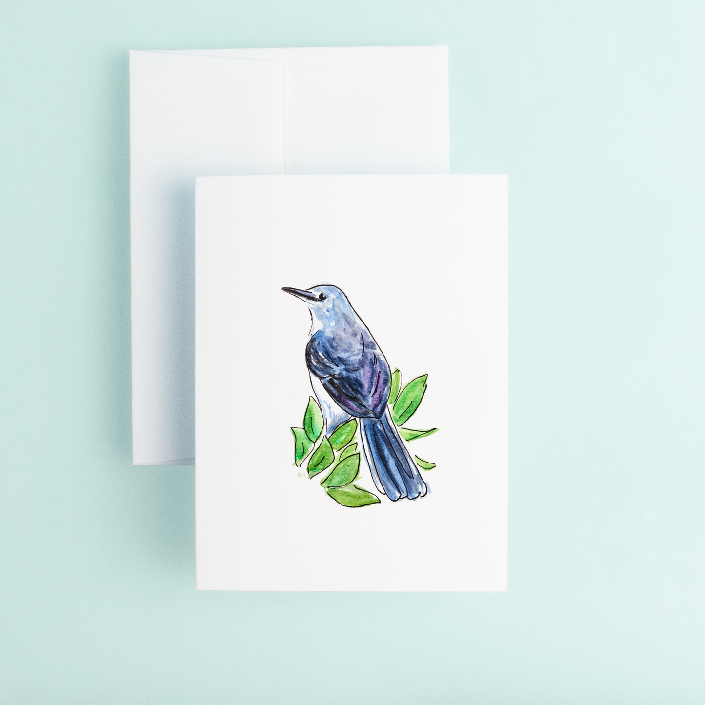 Regular price $3.50Introducing the charming A2 greeting card featuring the original watercolor art of Dallas-based artist Taylor Paladino. This card showcases the state bird of Texas, the Mockingbird, rendered in exquisite detail and printed on eco-friendly linen cardstock.