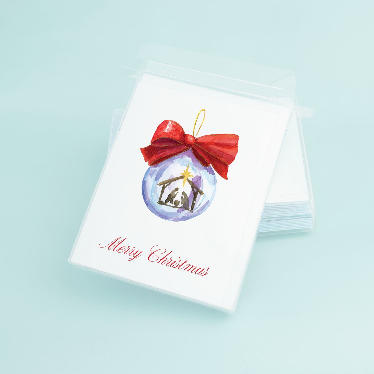 The front of the card showcases the stunning original watercolor design, with the nativity scene and Christmas ornament taking center stage. The colors are vibrant and true-to-life, and the details are expertly crafted to bring the image to life. The intricate brushwork of the artist is evident in every stroke, adding depth and dimension to the design.