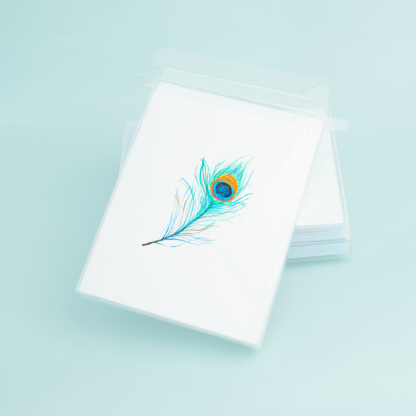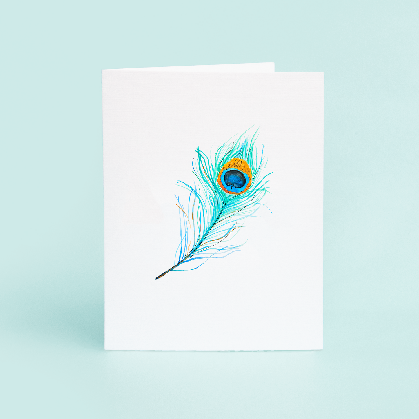 The quality of the cardstock complements the beauty of the peacock feather design. The linen texture adds a subtle depth and dimension to the card, making it a unique and special piece of art. The soft, muted colors of the cardstock enhance the vivid hues of the feather, creating a harmonious and balanced composition.