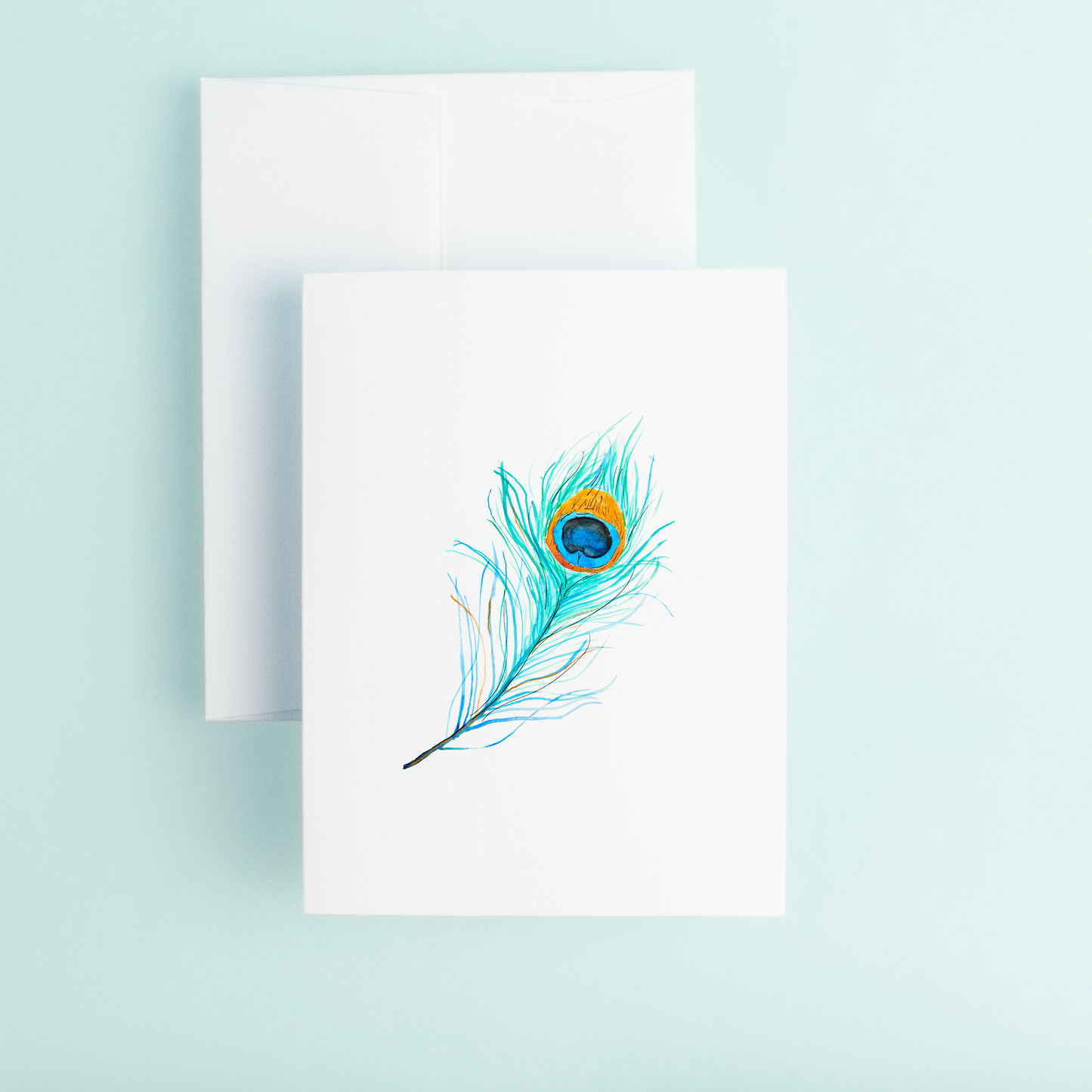 The front of the card showcases a beautifully painted peacock feather that captures the intricate details and vibrant colors of this magnificent bird. The feather is delicate and elegant, with each individual strand carefully painted in intricate detail. The watercolor technique used by Taylor Paladino brings a sense of movement and life to the feather, as if it could flutter off the page at any moment.