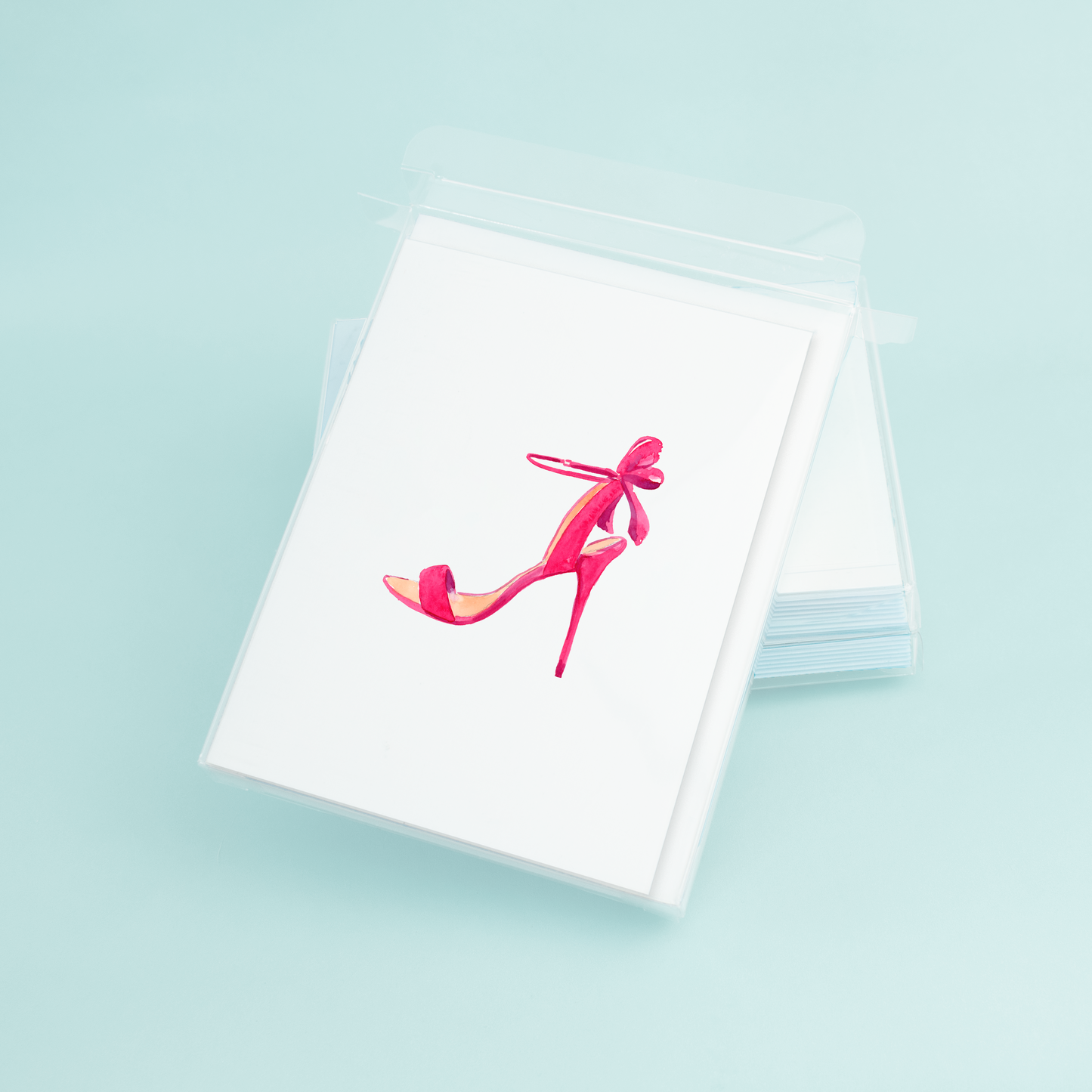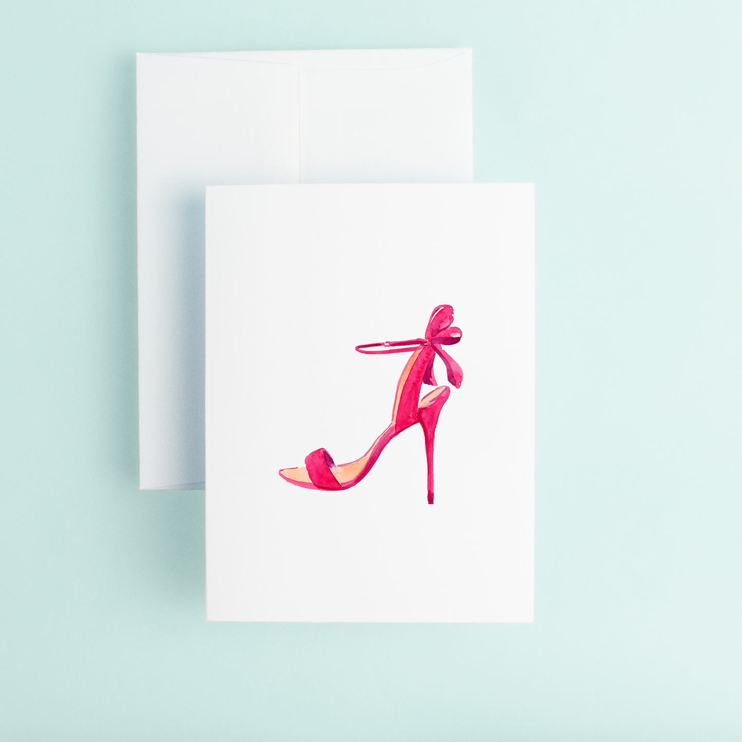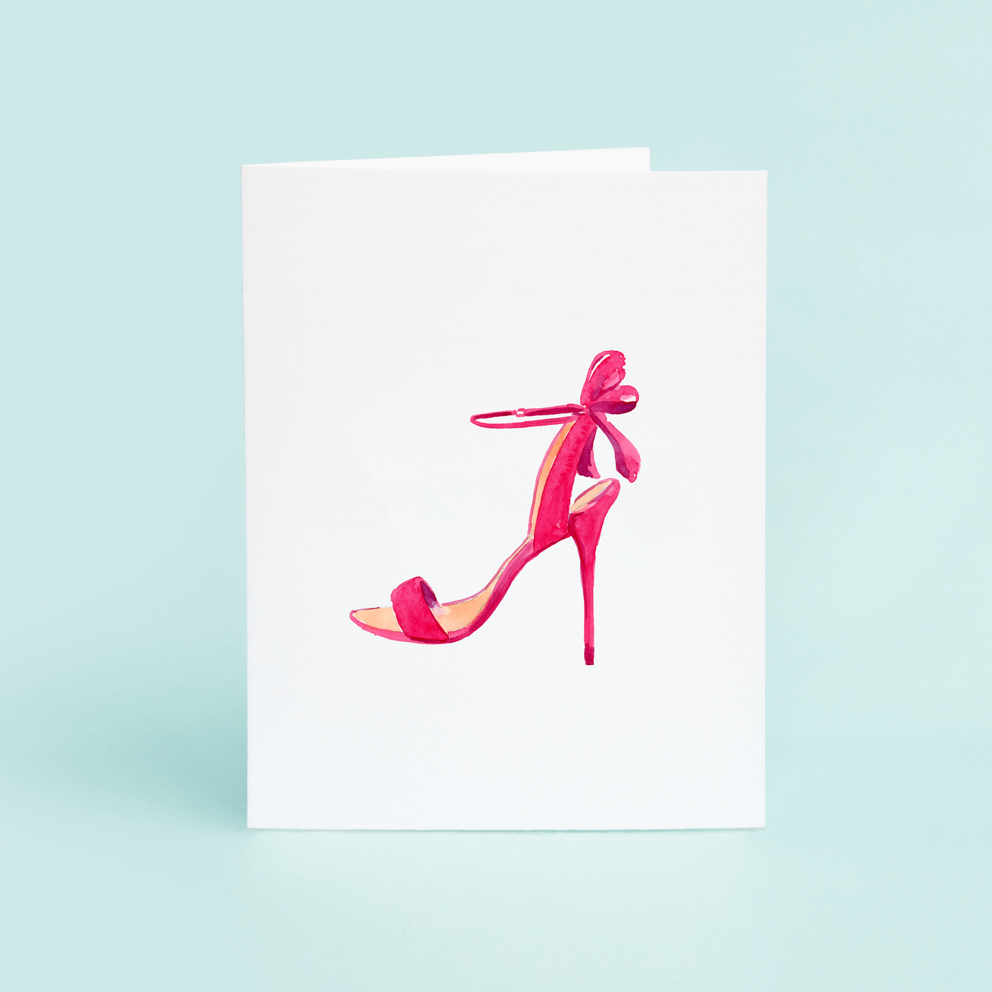 Measuring 4.25 x 5.5 inches, this card features an elegant pink wrap high heel shoe expertly painted with watercolors. The shoe is exquisitely crafted, with every detail expertly captured, from the sleek lines to the delicate wrapping.
