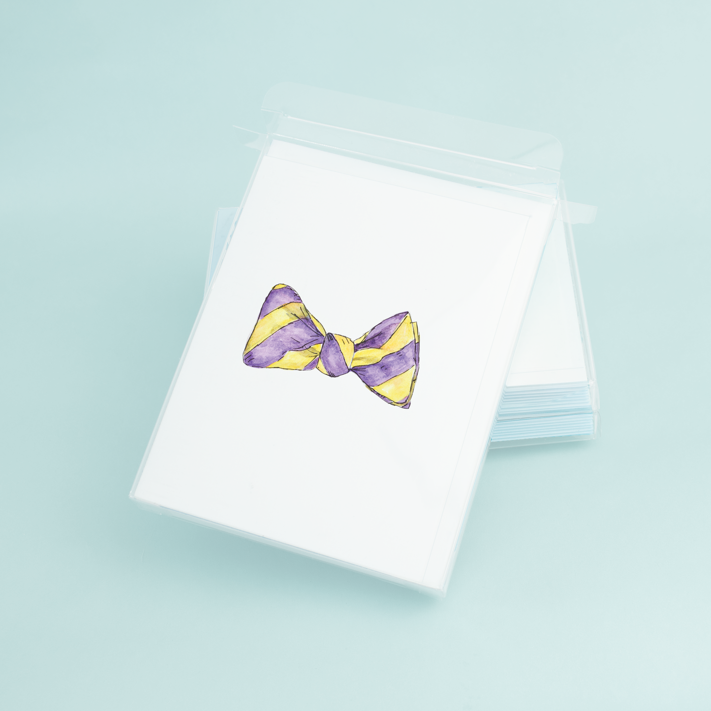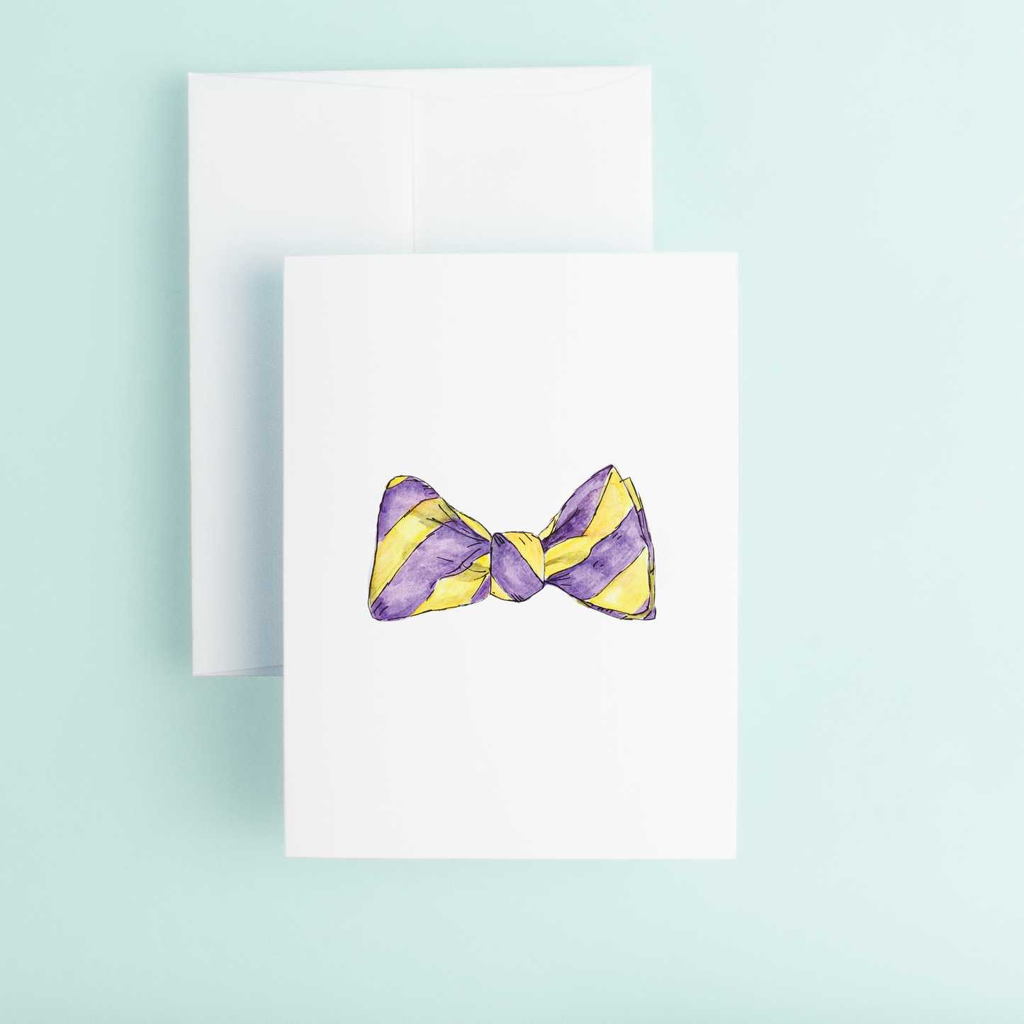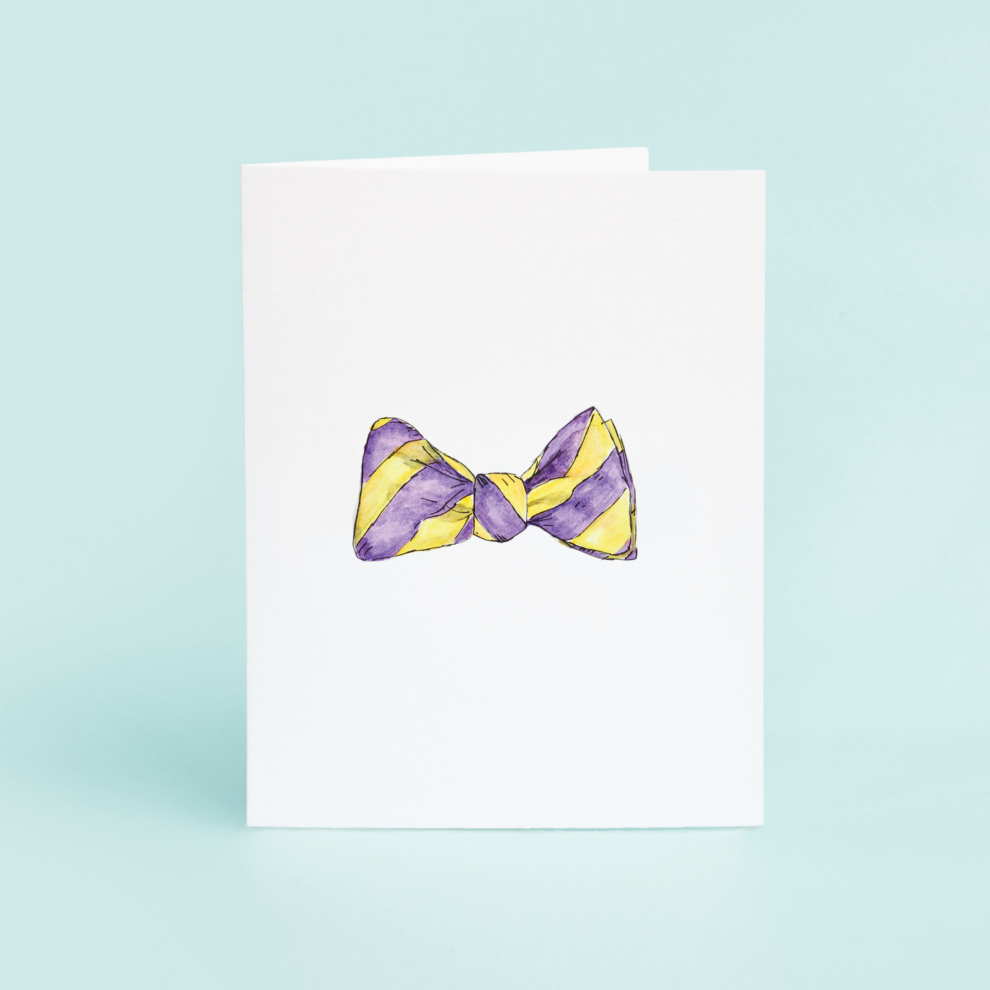 This greeting card comes with a matching eco-friendly linen envelope that complements the design perfectly, making it an excellent choice for a thoughtful and sustainable gift. Taylor Paladino's original watercolor design of the beautifully detailed purple and gold bowtie is a timeless piece that celebrates the beauty of fashion in a unique and captivating way.
