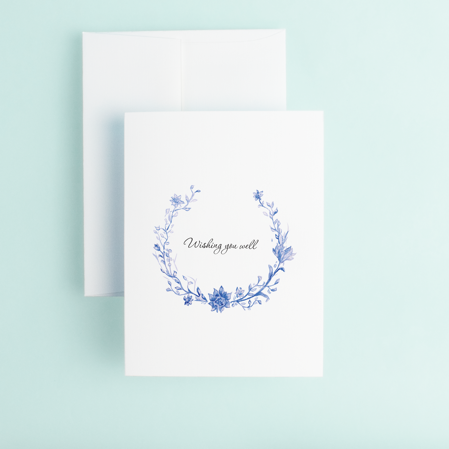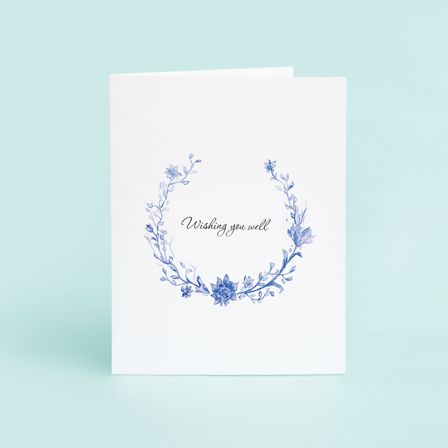In the center of the swag, the words "wishing you well" are written in elegant script, offering a heartfelt message to the recipient. The delicate and intricate details of the flowers, coupled with the skillful brushwork and use of color, make this card a true work of art that will surely be appreciated by anyone who receives it.